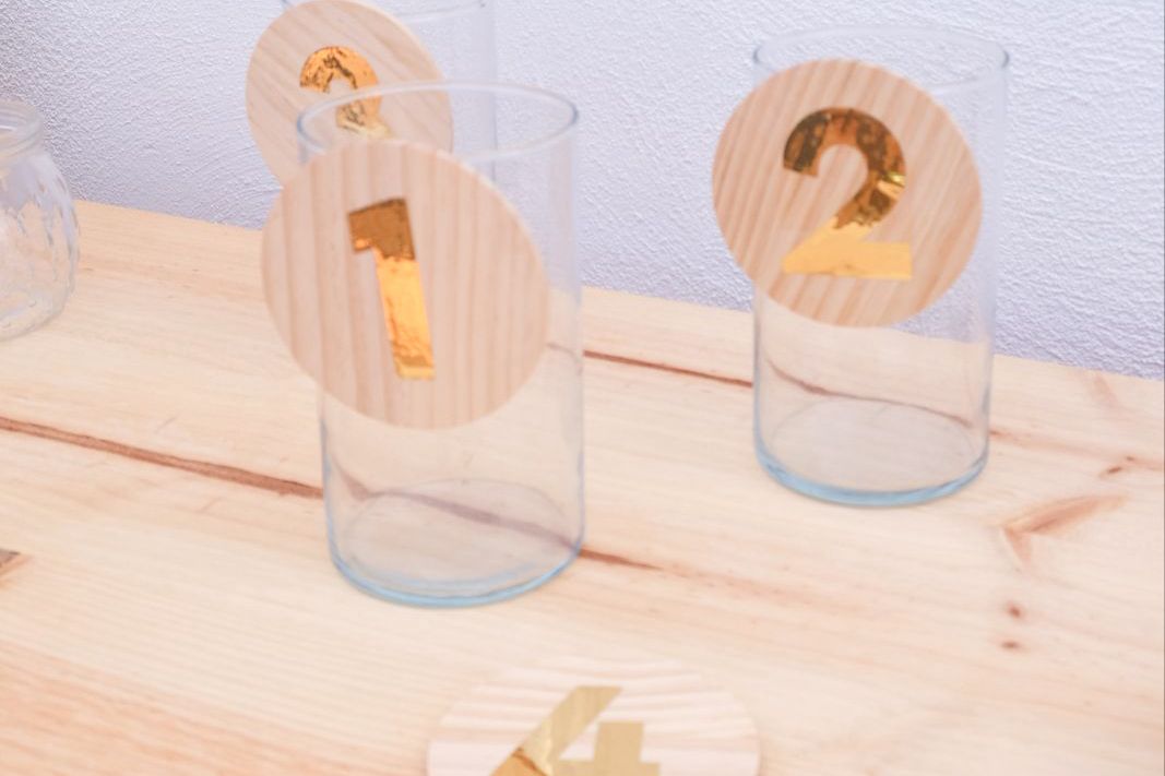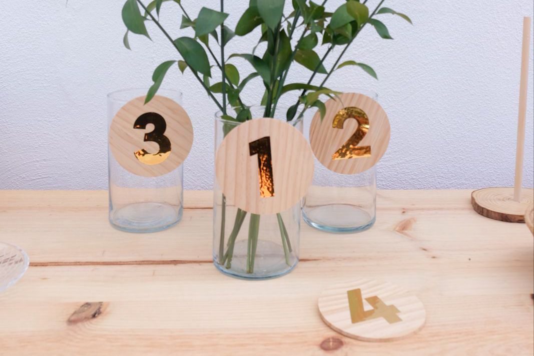 Números para mesas realizados con madera y vinilo dorado.