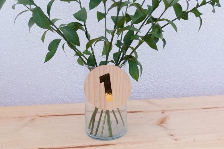 Números para mesas realizados con madera y vinilo dorado. Por la parte trasera llevan un enganche para que puedas acoplarlas en cualquier jarrón. Para otras opciones pídenos presupuesto desde el formulario de contacto.