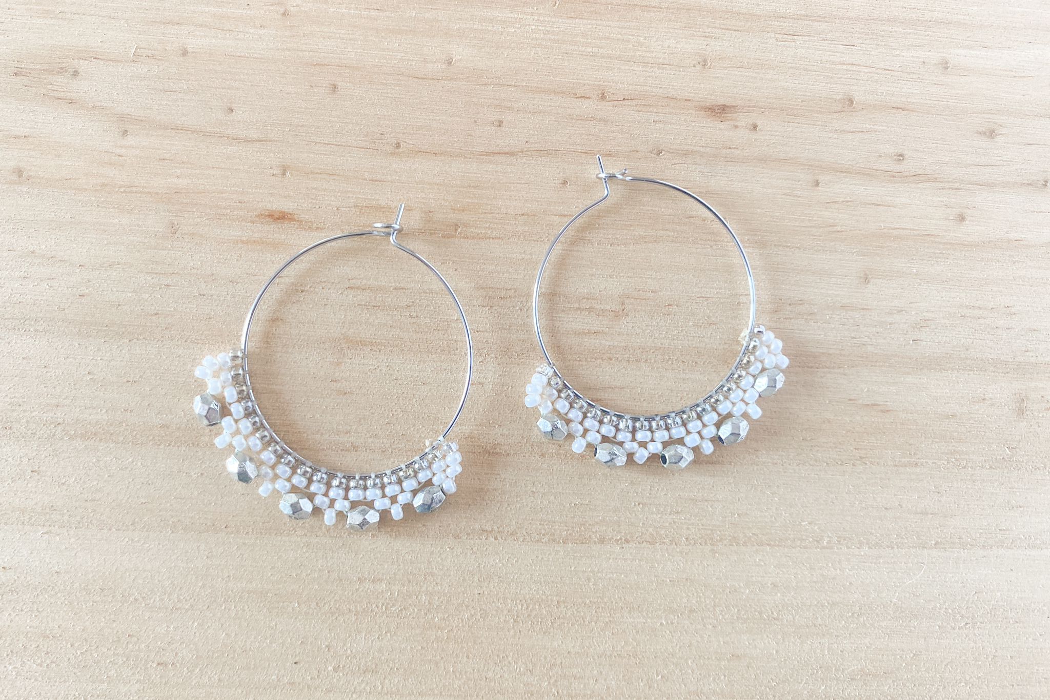 Pendientes con cuentas japonesas Miyuki y cuentas de acero. Diámetro del aro: 3cm. Material: acero inoxidable.